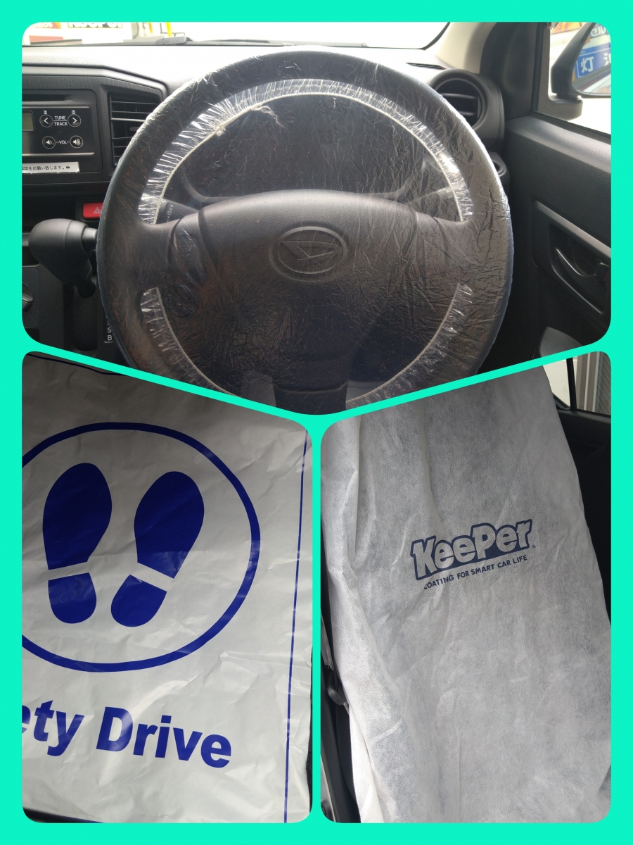 ☆当店のこだわり☆ お預かりしたお車には、 シートカバー、ハンドルカバー、マットカバーをしてお預かりします。