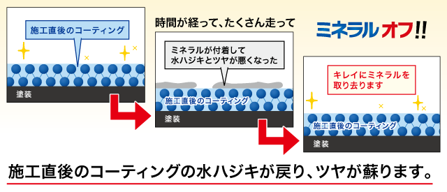定期的な洗車がおススメですが汚れが落ちやすくなるので洗車も楽になりますし、水弾きや汚れが気になるときはミネラル取り洗車で対応します。