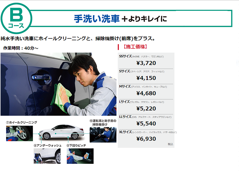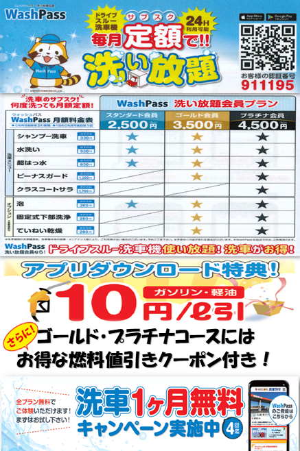 ドライブ洗車機完備 シャンプー洗車 ¥300円 手軽にお車をキレイにされたい方オススメ! 超はっ水洗車 ¥600円 お手軽に撥水効果 ビーナスガード¥1200 艶&水弾きがお手軽に手に入る 当店の洗車は24H利用可能 また当店はドライブスルー洗車機毎月定額で洗い放題 洗車1ヶ月無料 (4回迄)キャンペーン実施中