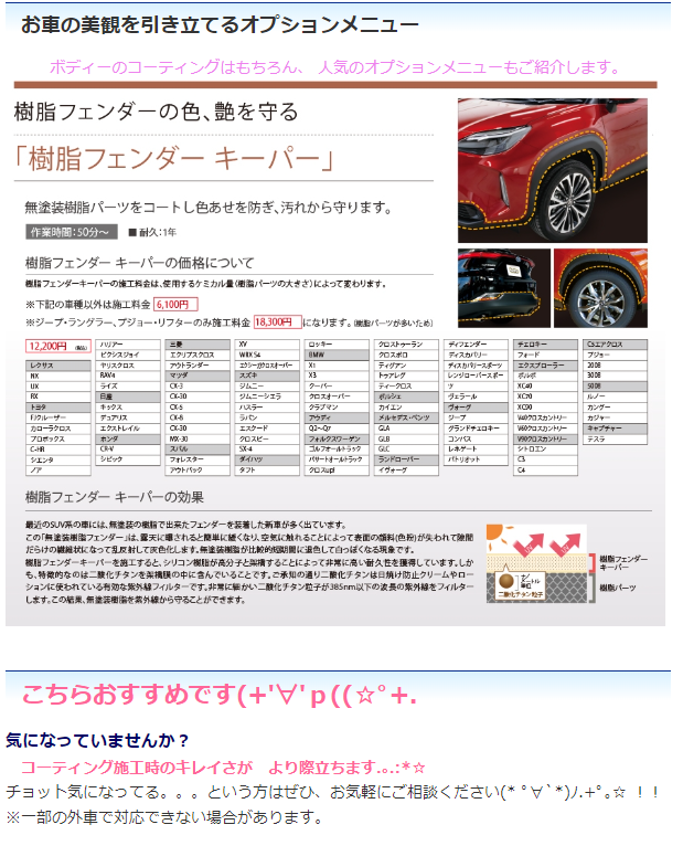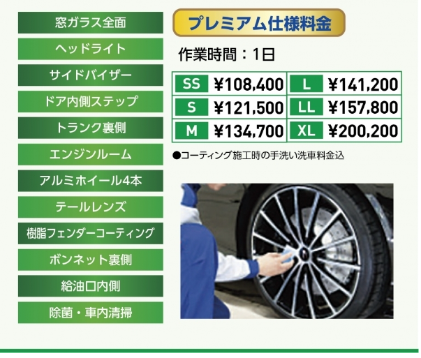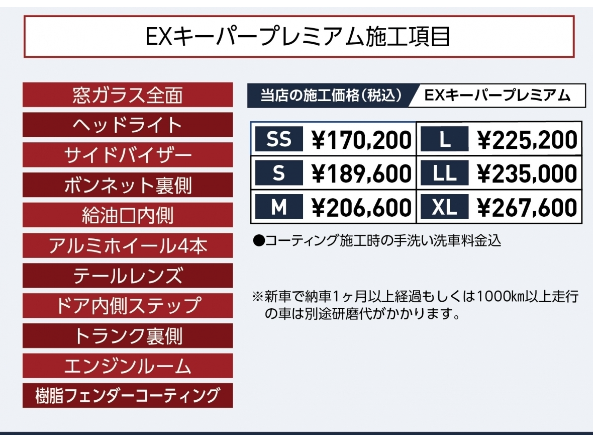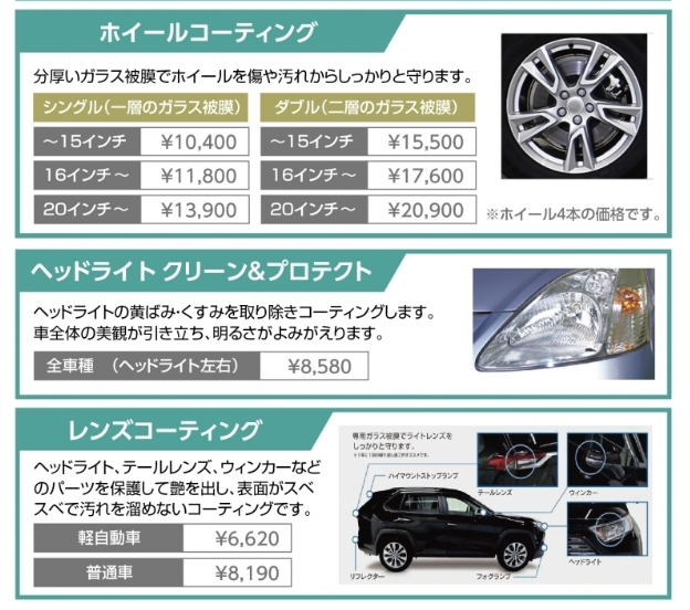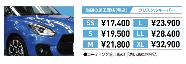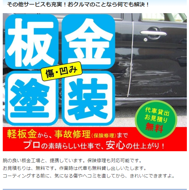 代車完備 無料の代車を用意しておりますので コーティング施工の際は貸出をしております 空きがあれば当日貸出しも可能です。 代車ご利用の際、お客様の保険証券確認 させていただきますので、ご了承ください。