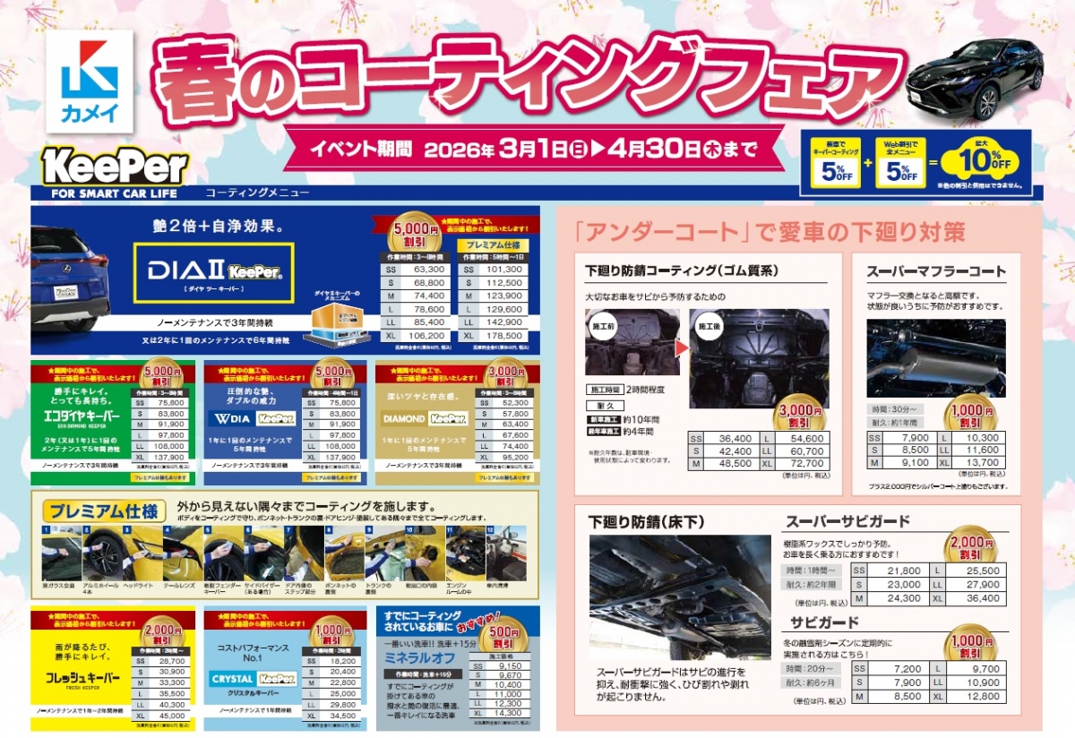 *キーパー施工車は、施工されていない一般車と比べ、汚れが簡単に落とせて大変洗いやすいため、価格がお安くなっております。受付時、施工証明書をご提示ください。他店でキーパー施工のお車もOK!施工証明書をご持参ください。(各キーパーコーティングの施工有効期限内のお車に限ります)