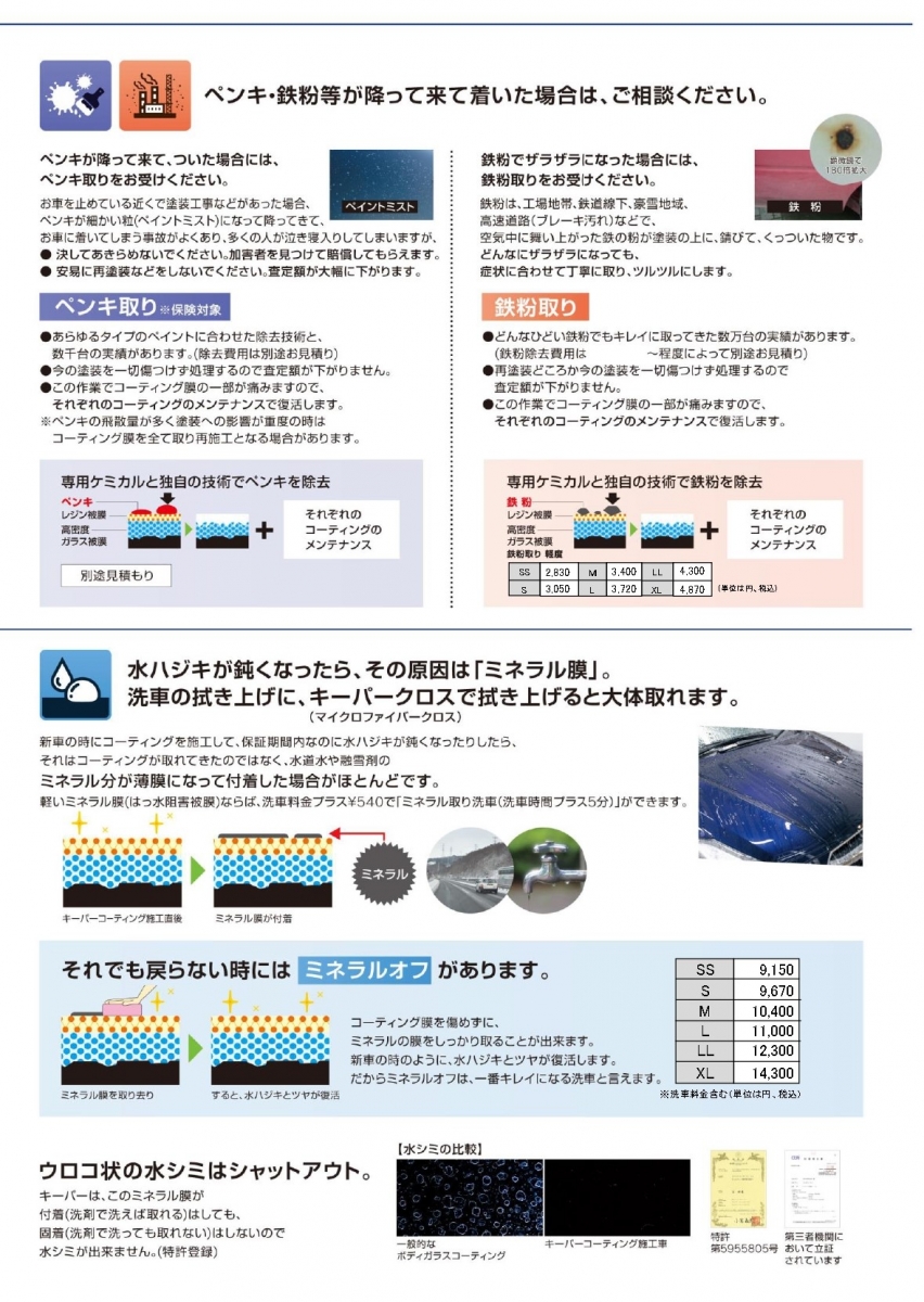 EXキーパーに加えて、トランク・ボンネットの裏・ドアの隅やヒンジなど、外から見えない塗装がされているあらゆる部分にEXキーパーを施工します。さらに、フッ素ガラスコーティング、ホイールコーティング、レンズコーティングが加わった、全キーパーシリーズの中で最もプレミアムなコーティングです。