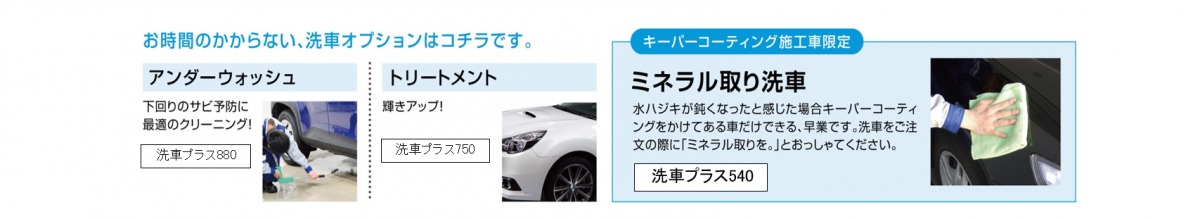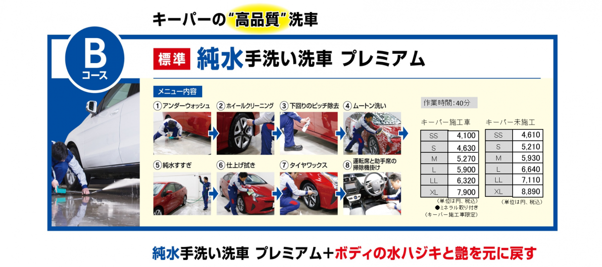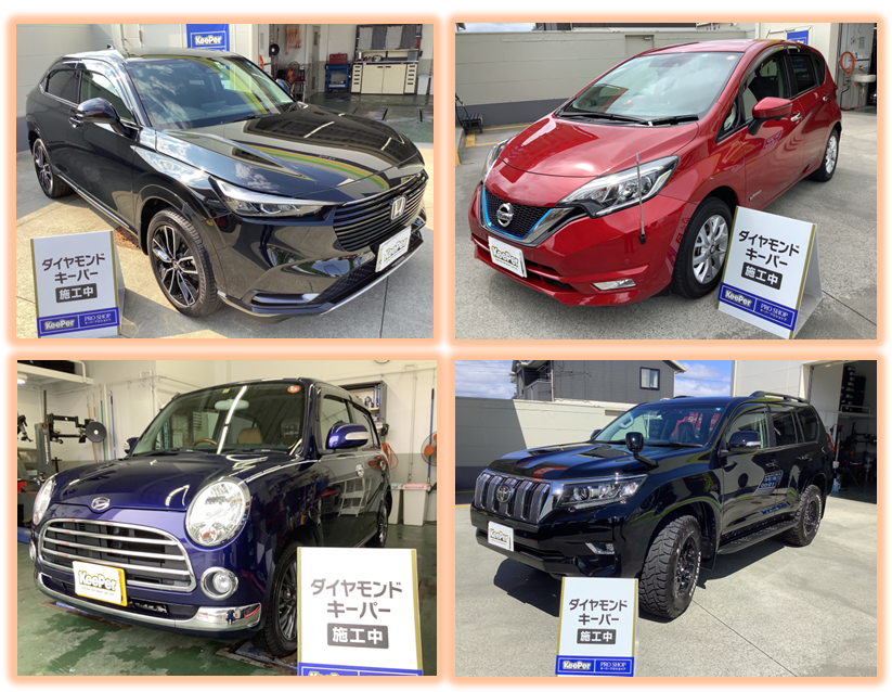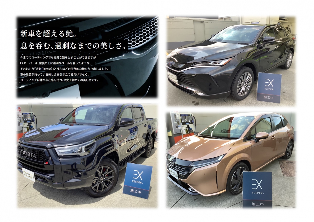 EXキーパーに加えて、トランク・ボンネットの裏・ドアの隅やヒンジなど、外から見えない塗装がされているあらゆる部分にEXキーパーを施工します。さらに、フッ素ガラスコーティング、ホイールコーティング、レンズコーティングが加わった、全キーパーシリーズの中で最もプレミアムなコーティングです。