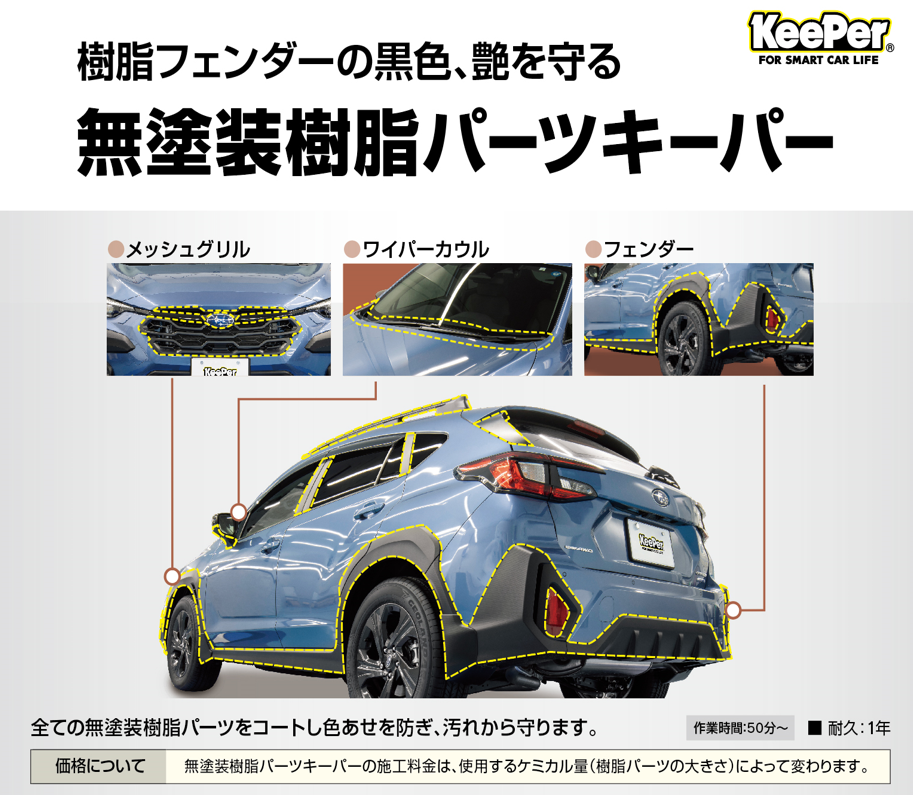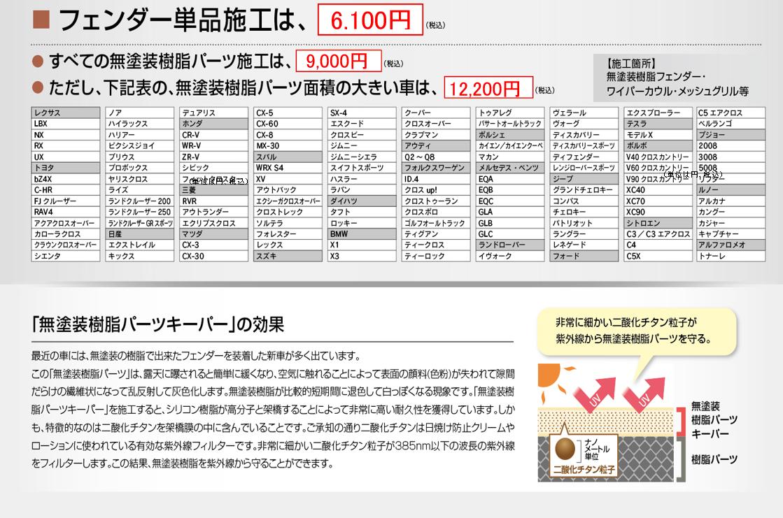 樹脂部が多い一部車種(ヤリスクロス・CH-R・CX-5・XV・ロッキー・キックス・ハスラーなど)や樹脂パーツの劣化具合により施工料金が異なります。¥12,200(税込)~