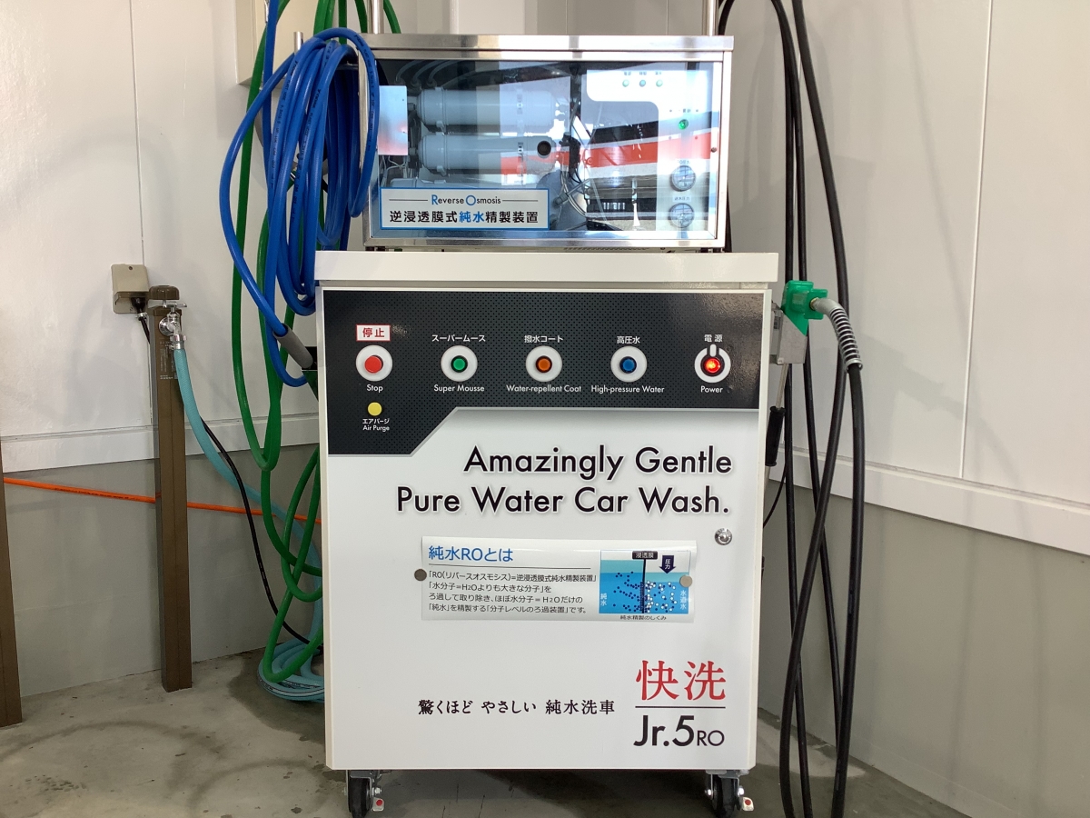 純水とは水道水の中に溶け込んでるナトリウムやマグネシウムなどをほぼ完全に除去したピュアな水です。①純水は、白くなるミネラルを除去しているので透明感のある仕上がりになります。②純水は『水シミ』の原因となるミネラルを除去しているのでシミの原因を残しません。③摩擦をほとんど与えないので塗装はもちろんコーティング膜も傷めず洗車ができます。