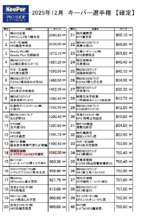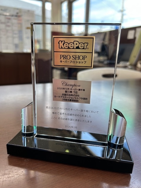 キーパー施工台数を競うキーパー選手権では、昨年12月四国で一番、全国14位の実績をおさめました。たくさんのご来店ありがとうございました。皆様のお車のキレイを維持できるようにこれからも勤めてまいりますよろしくお願いいたします。