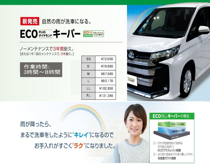 高密度ガラス、レジン被膜の2層の厚いコーティングでお車守ります。
