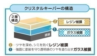 高密度ガラス、レジン被膜の2層の厚いコーティングでお車守ります。