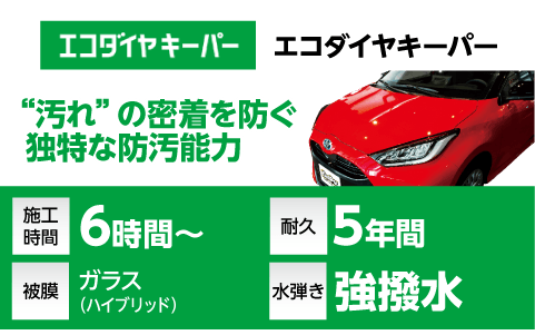 エコダイヤモンド(ECOプラスダイヤモンドキーパー)は、ボディガラスコーティングの一種で、汚れの密着を防ぐ防汚能力を持つカーコーティングです。