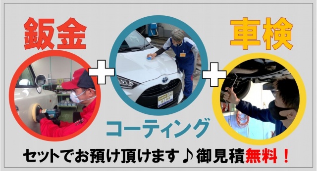 当店は、洗車・コーティングのほか車検・鈑金も承っていますので、車検とコーティング・鈑金とコーティングご一緒にお預かりできます。見積りも無料ですのでお気軽に当店スタッフにお声掛けください!