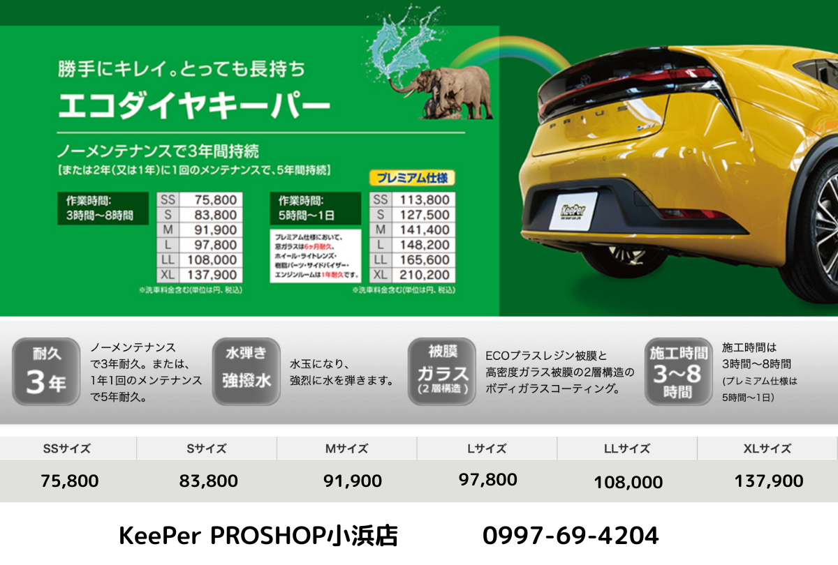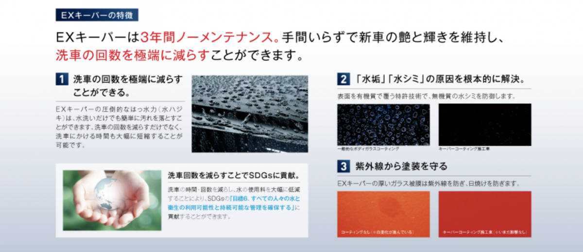 A新車のお客様には「EXキーパー」や「エコダイヤキーパー」を選ばれる方が多いです。美しさを引き立てながら長期間保護する効果があり、新車時の施工に非常におすすめです。