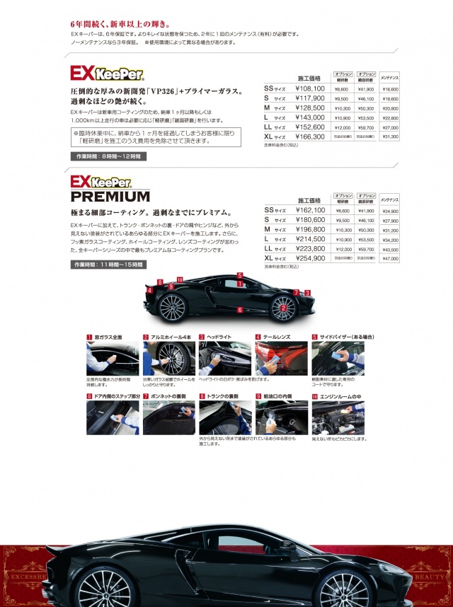2層のガラス被膜+1層のレジン被膜の3層構造で、圧倒的な深い艶が続きます。 1年に1度のメンテナンスで5年耐久とノーメンテナンスで3年耐久がありますが。