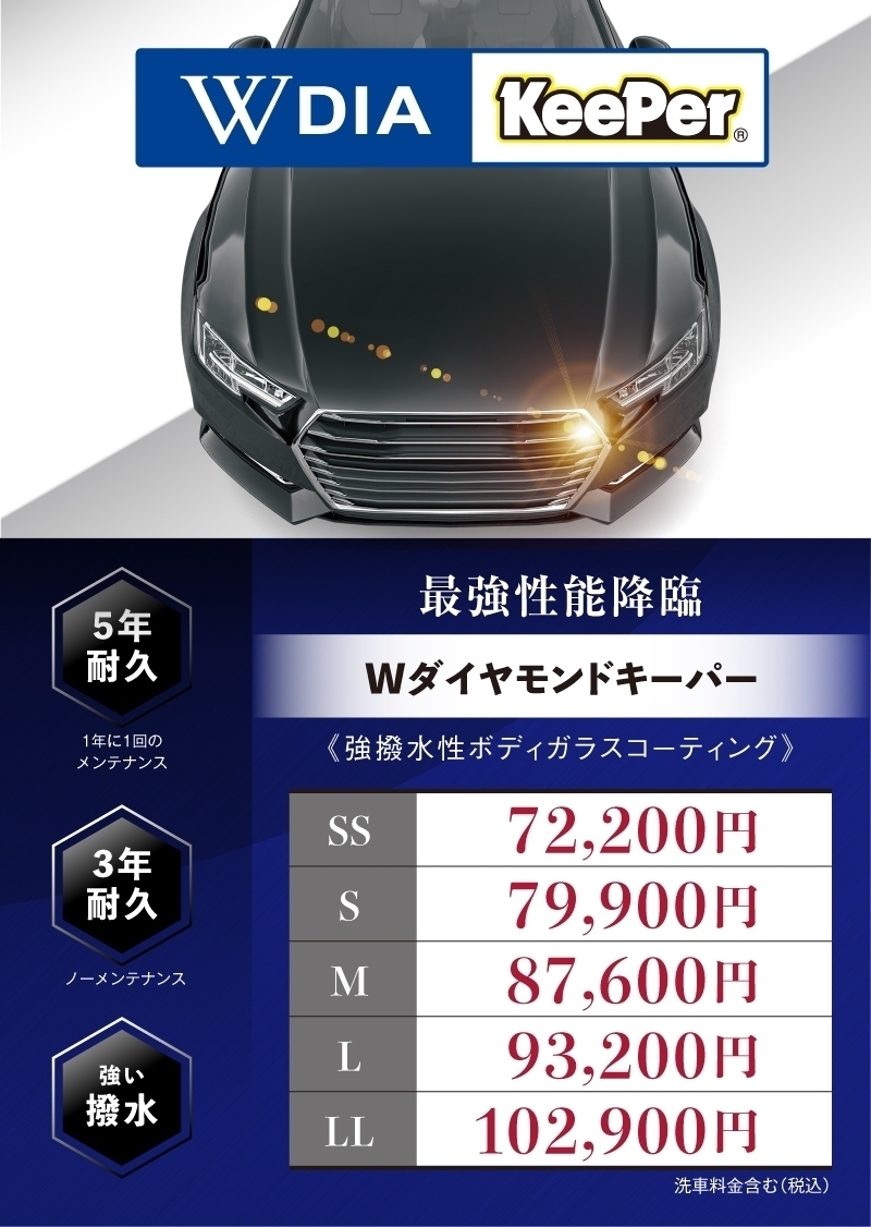 是非とも、一度ダイヤモンドキーパーまたはクリスタルキーパーを施工する事により、多層の汚れ、コーティング層をキレイさっぱり除去し、ガラス質の透明感あるツヤ、汚れにくいレジン被膜を乗せたキーパーコーティングをおすすめします。