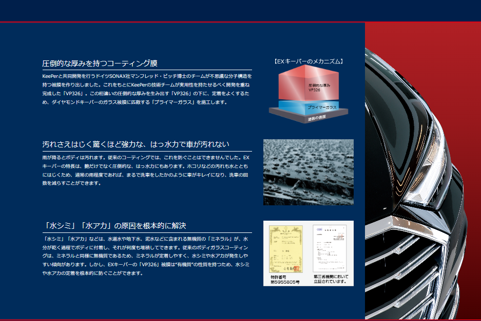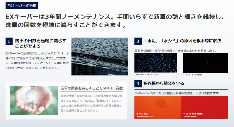 フレッシュキーパーは圧倒的な撥水力で、ホコリなどの汚れ の原因も水もろとも弾くので、普通に雨が降ると、 逆に車がキレイになってしまう不思議な現象があります。 そのため洗車の回数が減り、普段のお手入れが楽になります!!