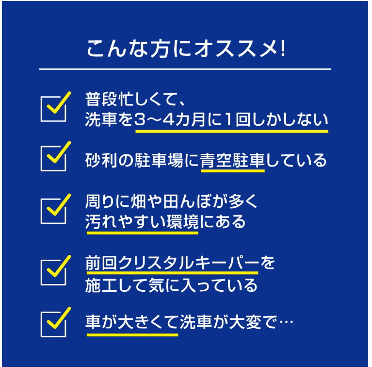 対応可能汚れ:花粉 黄砂 塩カル 融雪剤 海風 潮風 樹液 鳥の糞 虫 ウロコ 水シミ 水垢 ウォータースポット