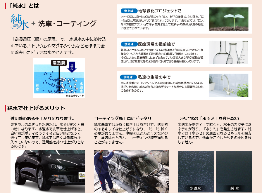さらに、最後の仕上げで使用する「純水」は、今までの洗車とは別次元のピュアな仕上がりを実現します。
