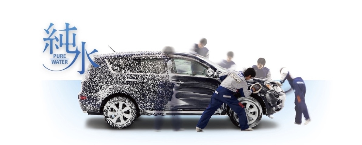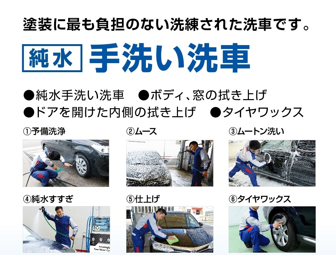 当店の手洗い洗車は、「ムース(泡)洗車」です。 この「ムース」の泡は、洗浄力のためのシャンプーではなく、クッションとすべり剤の役割を果たす「ムース(泡)」で、砂ボコリなどの摩擦から、やさしくお車を守りながら、洗います。ちょうど、シェービングクリームのようなものです。 まれにある「シャンプー洗車禁止のコーティング車」にでも、(新車時のコーティングに、まれにあります。)「ムース手洗い洗車」なら、安心してお任せいただけます。また、当店では仕上がりにこだわった、「純水」を使用した洗車となります。「純水」とは水道水の中に溶け込んでいるナトリウムやマグネシウムなどをほぼ完全に除去したピュアな水のことです。 【純水洗車のメリット】 純水は、白くなるミネラルを除去しているので、透明感を持つ仕上がりとなります。 摩擦をほとんど与えないので、塗装はもちろん、コーティング膜を痛めることがありません。 純水では、「水シミ」となるミネラルを除去しているので、シミの原因を残しません⇩⇩⇩
