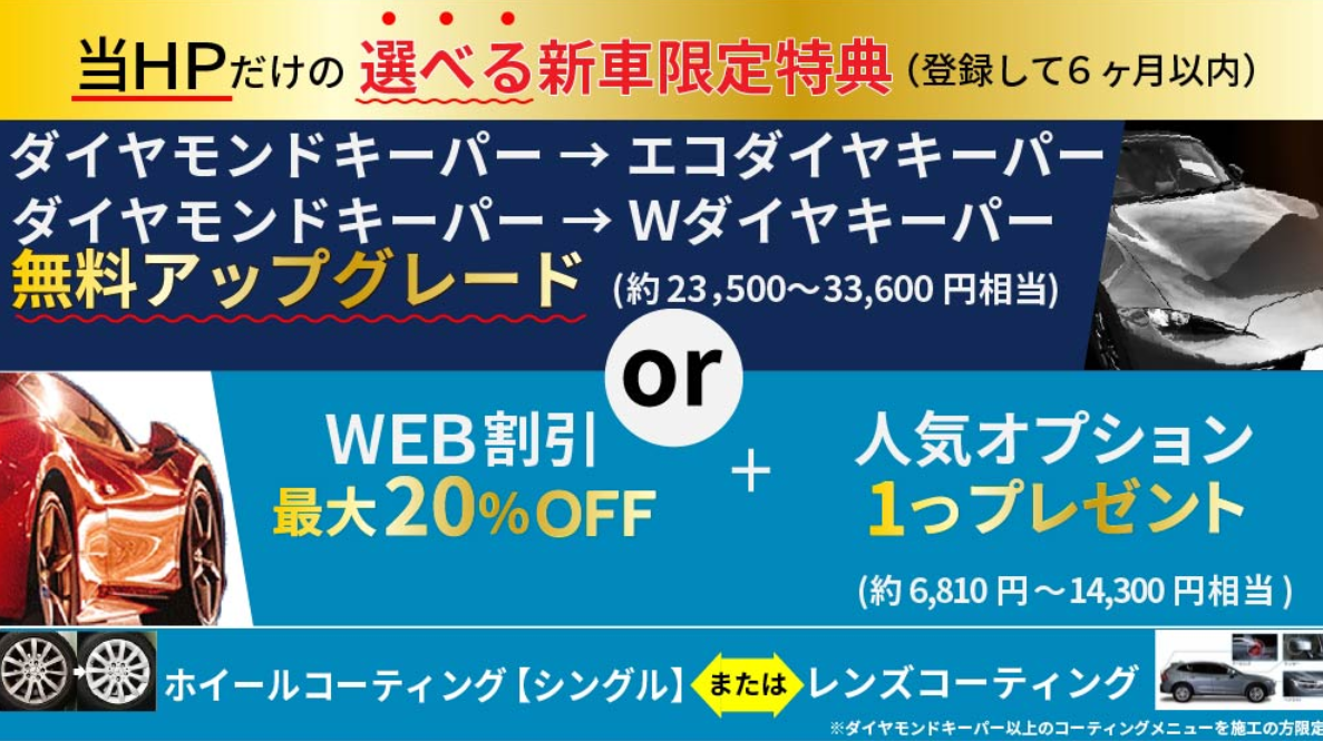 【新車のお客様対象】 ダイヤモンドキーパーから(Wダイヤモンドキーパー)or(エコダイヤキーパー)への無料アップグレード!19,000円相当!! 新車(登録して6ヶ月以内)にダイヤモンドキーパーを施工される方には、同料金にてエコダイヤキーパーまたはWダイヤモンドキーパーにランクアップさせて頂きます。 ※アップグレードの際、インターネット割引との併用は不可となります。