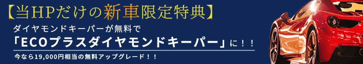 【新車のお客様対象】 ダイヤモンドキーパーからECOプラスダイヤモンドキーパーへの無料アップグレード!19,000円相当!! 新車(登録して6ヶ月以内)にダイヤモンドキーパーを施工される方には、同料金にてECOプラスダイヤモンドキーパーまたはWダイヤモンドキーパーにランクアップさせて頂きます。 ※アップグレードの際、インターネット割引との併用は不可となります。