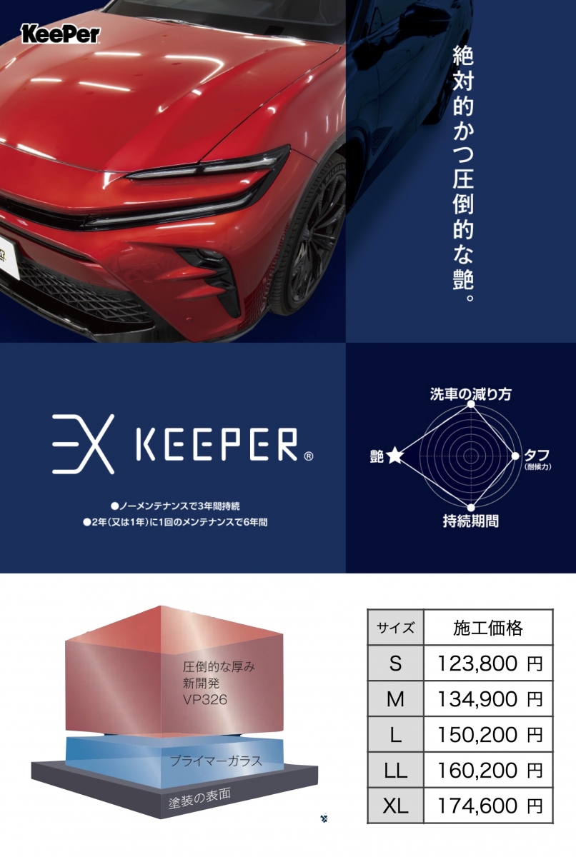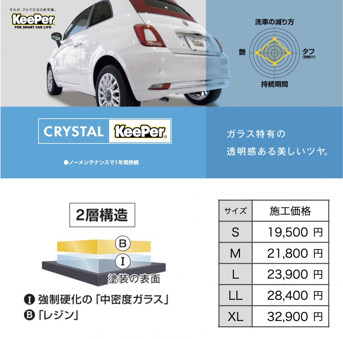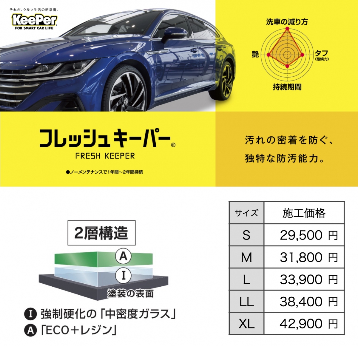 元々持っている撥水力ではじかれた水と一緒にホコリなどの汚れが流れ落ち、まるで洗車をしたようにキレイになります。 ※雨自体が黄砂等を含んでいる場合は汚れます。(洗車をしてください) 【こんな方におススメ】 ●洗車回数を減らしたい方 ●艶より汚れにくさをお求めの方 ●新車でお車を購入された方 【施工時間】 4時間〜8時間 キレイと楽するは両立できる。 フレッシュキーパー クリスタルキーパーと同様に、被膜形成段階で強制的に水分と接触させて分厚いガラス被膜を造り、2層目にECOプラスレジン被膜を重ねて形成することで、ECOプラスダイヤモンドキーパーと同様の独特な防汚能力により汚れの密着を防ぎます。 【こんな方におススメ】 ●普段のお手入れを減らしたい方 ●汚れにくさをお求めの方 ●コストを抑えたい方 ●3年以上はお乗りになられない方 【施工時間】 2時間〜 エントリーモデル クリスタルキーパー 1年毎に新車に戻る新感覚コーティング。 約90分からの施工で、ガラス特有の透明感のあるツヤを実現。 今お乗りのお車も新車のようにキレイになります。 ノーメンテナンス洗車だけで、1年耐久 【特徴】 ●キレイで目立って素敵になる。 ●水ハジキが良く、キレイが続く。 ●汚れにくく、お手入れがラクになる。 ●透明感のあるツヤ。 ●1年に1度の繰り返し施工でツヤが良くなる。 【こんな方におススメ】 ●お手頃価格で本物のボデイガラスコーティングをご希望の方 ●なかなか、お時間の都合がつかない方 ●普段のお手入れは洗車だけとお考えの方 ●3年以上はお乗りになられない方 【施工時間】 90分〜 圧倒的な厚みを持つコーティング被膜。 桁違いの圧倒的な艶を生み出す「VP326」。その下部の1層目には定着をよくするため、ダイヤモンドキーパーのガラス被膜に匹敵する「プライマーガラス」を施工。従来の倍に相当する2ミクロンのコーティング被膜を実現。 汚れさえはじく驚くほど強力な、撥水力で車が汚れない。 艶だけではなく圧倒的な撥水力により、ホコリなどの汚れも水とともにはじくため、通常の雨程度であれば、まるで洗車をしたかのように車がキレイになり、洗車の回数を減らすことができます。 ベールを纏ったような不思議な触り心地。 乾燥時でもしっとりと濡れたような不思議な感触。視覚だけではなく、触覚でもその差は歴然。今までのカーコーティングとは違うことが触れた指先から伝わります。 水シミ・水アカの原因を根本的に解決。 水シミ、水アカなどは、水道水や地下水、泥水などに含まれる無機質の「ミネラル」が、水分が乾く過程でボディに付着し、それが何度も堆積してできます。従来のボディガラスコーティングは、ミネラルと同様に無機質であるため、ミネラルが定着しやすく、水シミや水アカが発生しやすい傾向があります。しかし、EXキーパーの「VP326」被膜は、“有機質”の性質を持つため、水シミや水アカの定着を根本的に防ぐことができます。 6年間続く新車以上の輝き。 2年(または1年)に1回のメンテナンスで6年保証。ノーメンテナンスの場合は3年 【施工時間】 10時間〜1日 EXキーパーは新車用のため1,000km以上走行の車は必要に応じ研磨を行います。(有料) 美しさに格別のこだわりを。 当店の手洗い洗車は、「ムース(泡)洗車」です。 【純水洗車のメリット】 ●透明感のある仕上がりになります。 純水は、白くなるミネラルを除去しているので、透明感を持つ仕上がりとなります。 ●コーティング施工車にピッタリ。 摩擦をほとんど与えないので、塗装はもちろん、コーティング膜を痛めることがありません。 ●ウロコ状の「水シミ」を作らない。 純水では、「水シミ」となるミネラルを除去しているので、こうしたシミの原因を残しません。 ●手洗い洗車 ●虫落とし ●ボディ、窓の拭き上げ ●ドアを開けた内側の拭き上げ ●タイヤワックス 作業時間:25分〜 【Aコースの内容にプラス】 ●ホイールクリーニング ●アンダーウォッシュ ●前席掃除機がけ ●トランク(裏側)汚れ落とし 作業時間:Aコース+15分〜 【Bコースの内容にプラス】 ボディの水ハジキと艶を元に戻す。 どんなコーティングでも乗っていて水ハジキが悪くなったら、それは多くの場合、“無機質のミネラルの膜が着いた”からです。 ミネラルは水道水、地下水に(関東に多い)含まれます。 最新のミネラルオフは、コーティングに全く影響を与えず、キレイにミネラルの膜を取り去り、水ハジキが戻り、艶が蘇ります。 作業時間: Bコース+15分 ベストセラー!3カ月に1度の施工でドラマティックな感動をお客様へ 【施工時間】 洗車時間+20分 ※お車によっては超える場合も短くなる場合もあります。 【水弾き】 撥水 撥水指数:★★★★ 【メリット】 ・キーパー唯一のポリマー系コーティング ・施工を繰り返せば繰り返すほど塗装面の改善を実現(特許取得済) ・コーティング未施工車で洗車とついでにより深くキレイにする! ・ポリマー特有の深いツヤを実現 【