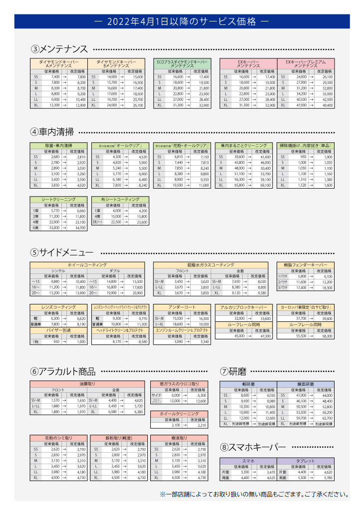 『Web割引き・新車割引き』あります。 Webからの御予約で5%引き 新車登録から半年以内のお車は5%引き ●Wダイヤモンドキーパー ●ダイヤモンドキーパー ●クリスタルキーパー が、なんと!! 最大10%引きになります。 ぜひ、御利用下さい。 御予約は⇓⇓⇓で予約サイトへ!!
