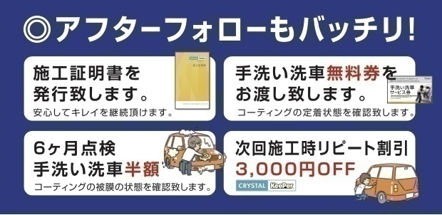 その他、定期的にコーティング被膜の定着状態の確認や、洗車サービス、次回施工時の割引なども行っております。