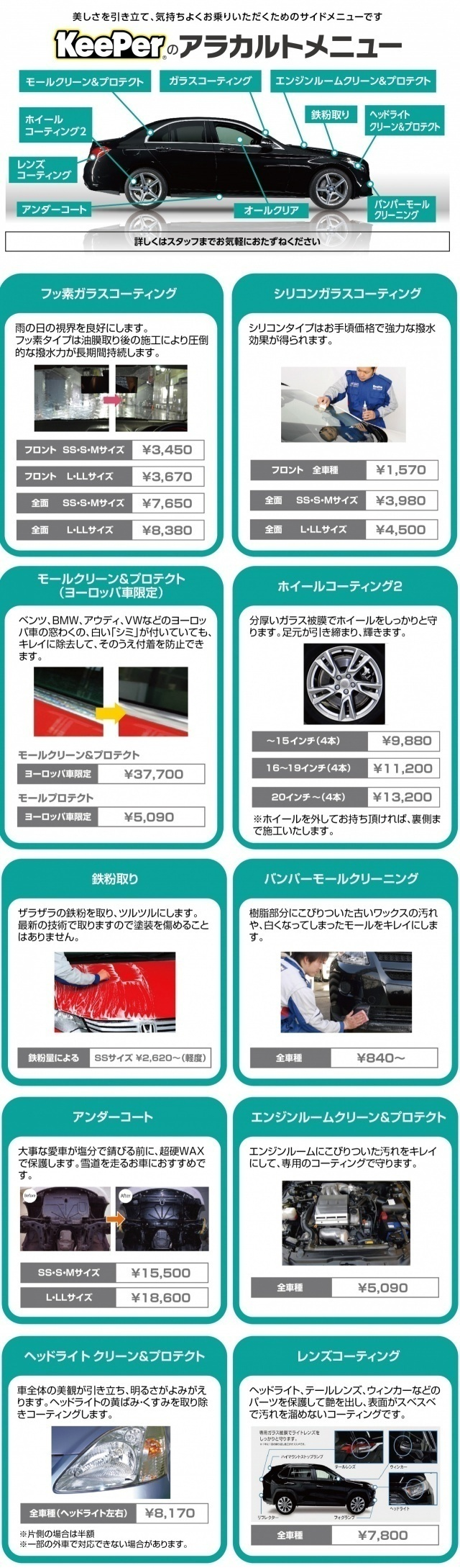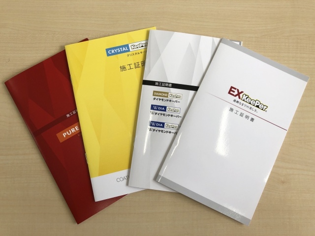 またその他にもピュアキーパー、クリスタルキーパー、ダイヤモンドキーパー、Wダイヤキーパー等を施工してあるデモカーをそれぞれご用意しておりますのでご覧になりたい方は担当者までお気軽にお申し付けください。