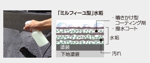 ハンドスプレー型のコーティング剤は、一般的にコーティングの下地処理をせず水垢の残ったままの面に塗り重ねるので汚れの膜の上からコーティングを乗せる事になります。汚れの層、コーティング層を重ねる毎にミルフィーユ型の水垢となり、愛車の美観を損なっていきます。