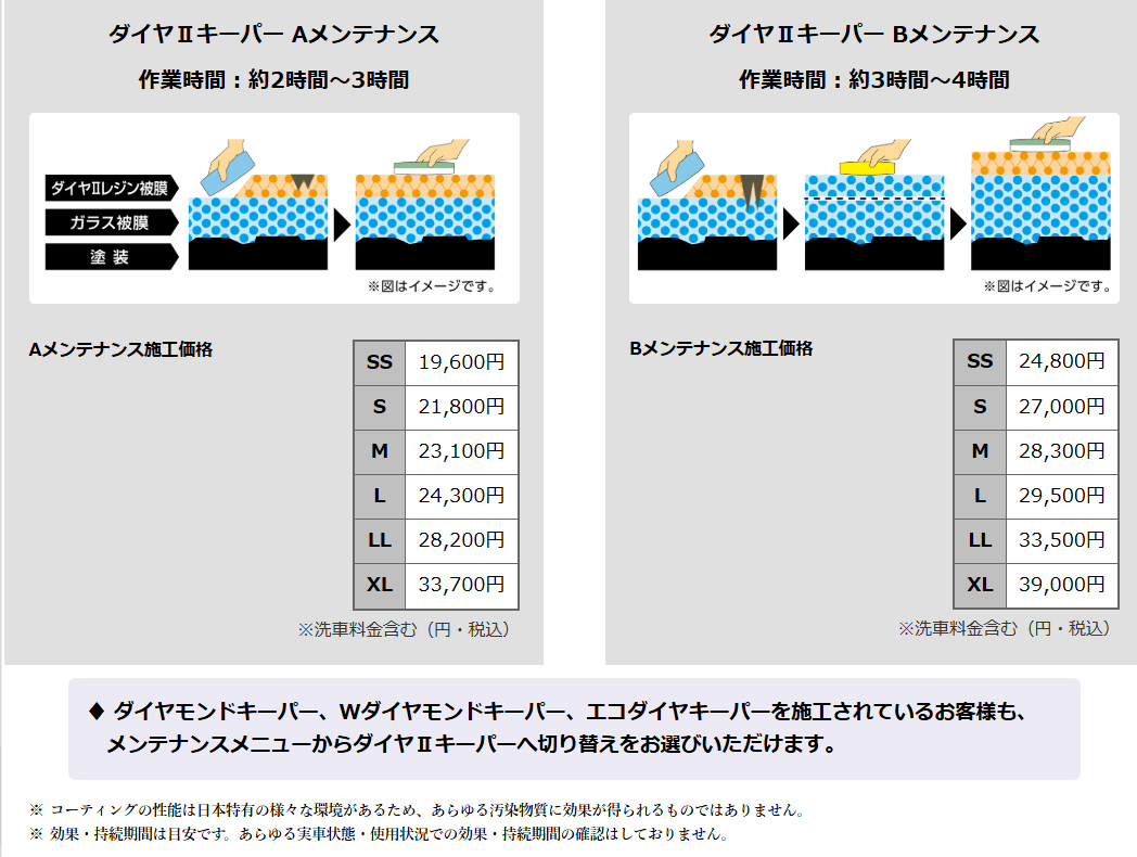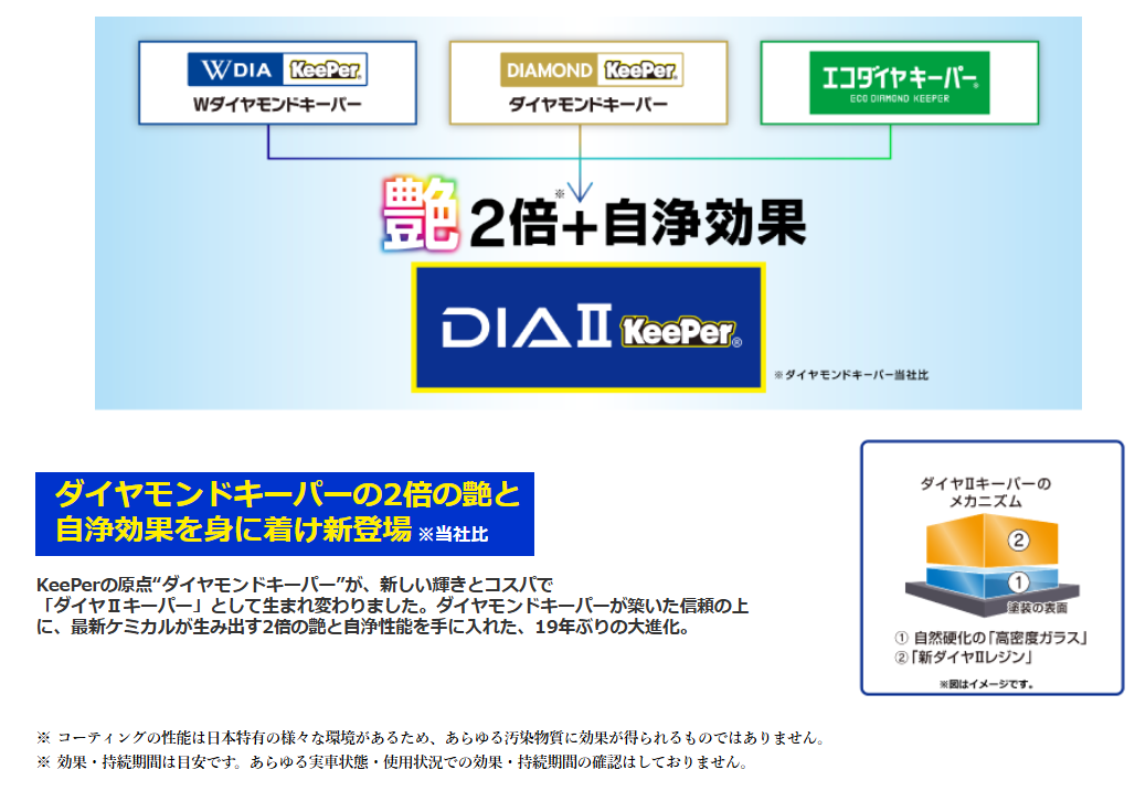 ダイヤⅡコーティングのご予約は、店頭のみの受付とさせていただきます。進化したダイヤモンドキーパーを、いち早く施工したいお客様は、ご検討宜しくお願い致します。さらに、もともとダイヤモンドキーパーを施工されているお客様!必見!メンテナンスでダイヤⅡコーティングのメンテに切り替え可能!さらにメンテナンスが1年から⇒2年に!もともと各種ダイヤモンドキーパー愛用のお車は必見です。