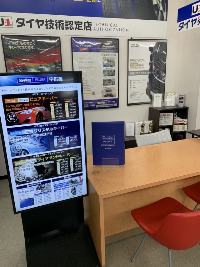 店頭受付カウンターでは最新デジタルサイネージにて当店情報を掲示中!2名様まで座ってご案内できる受付カウンターもございます!