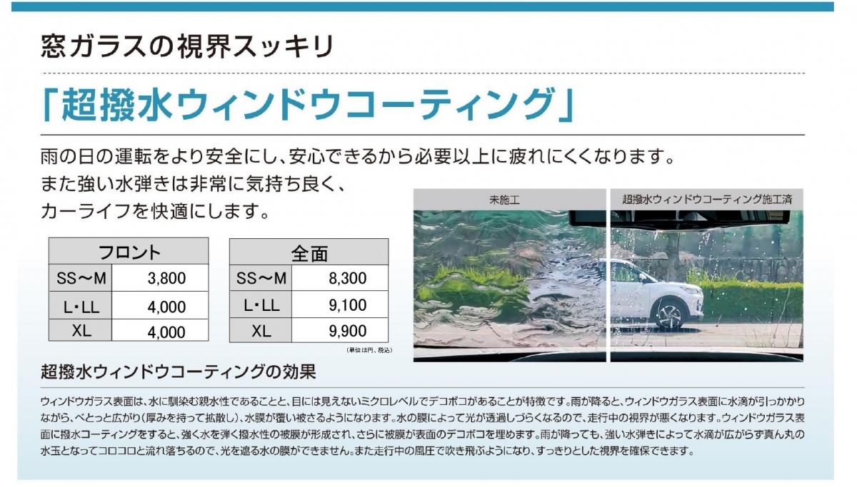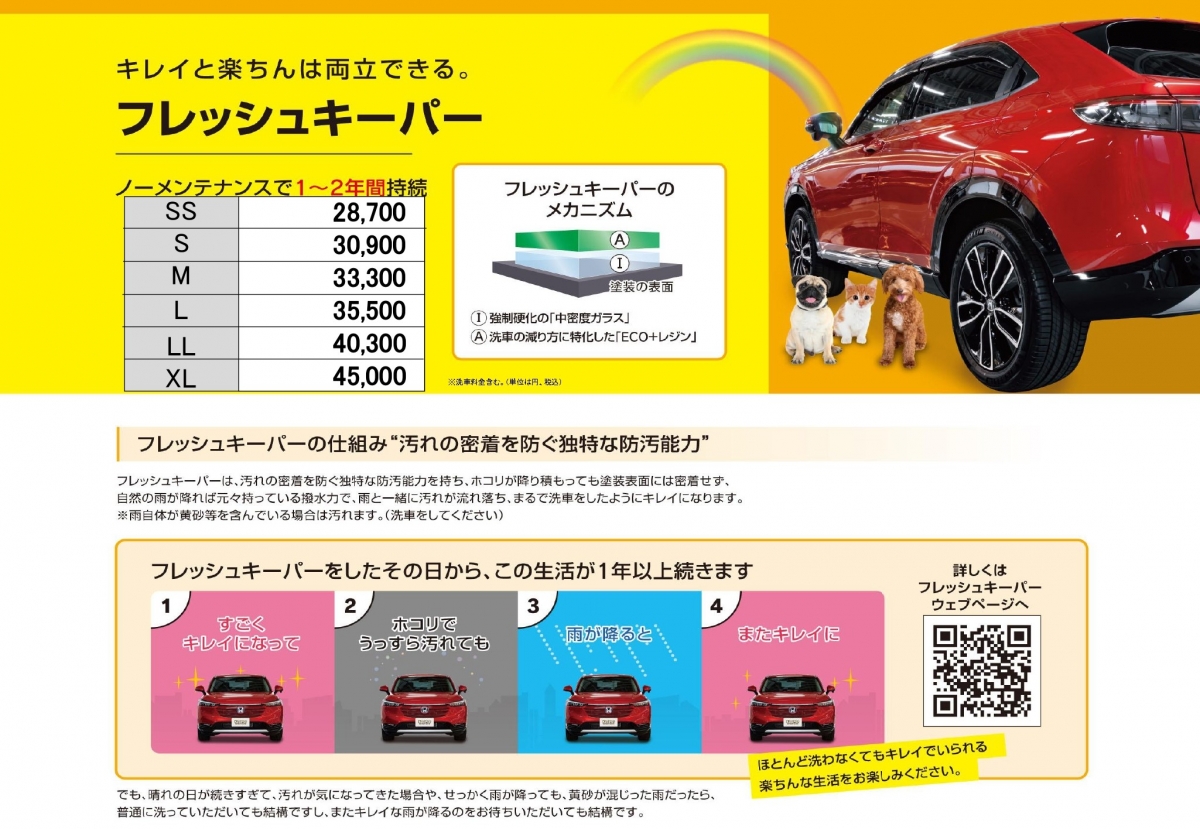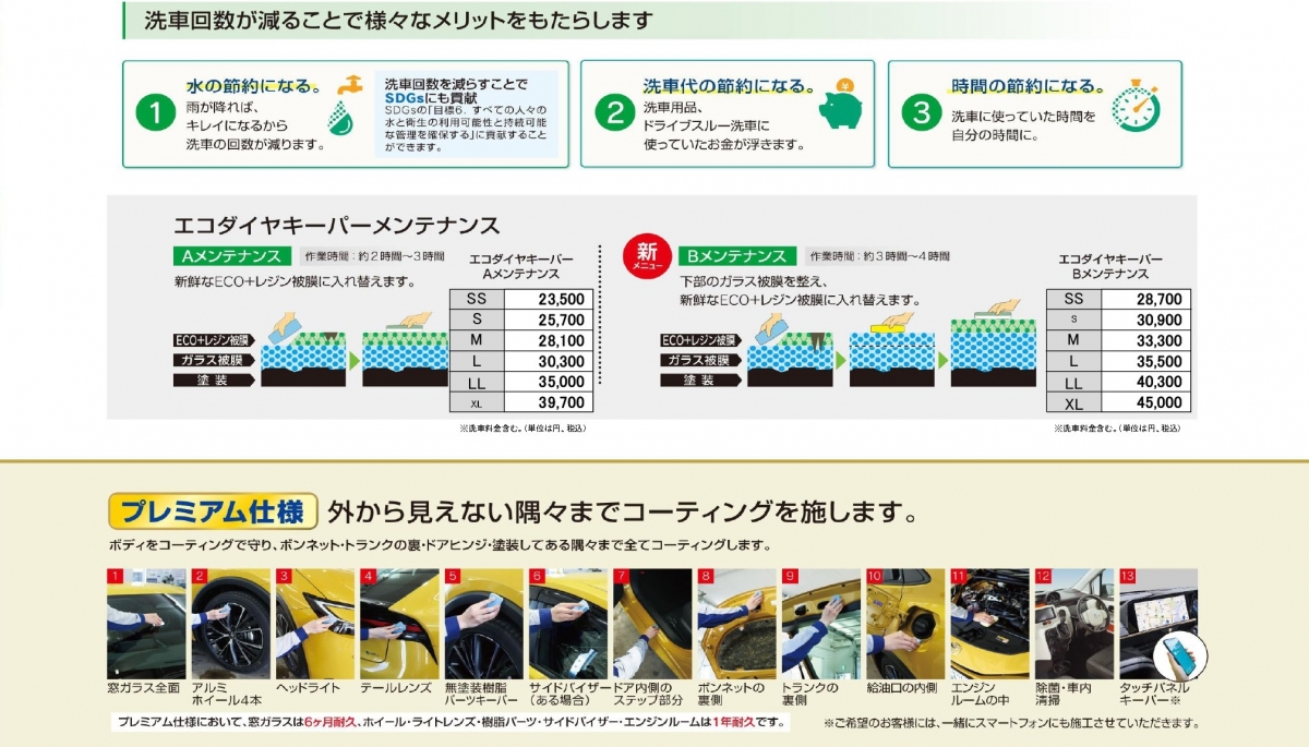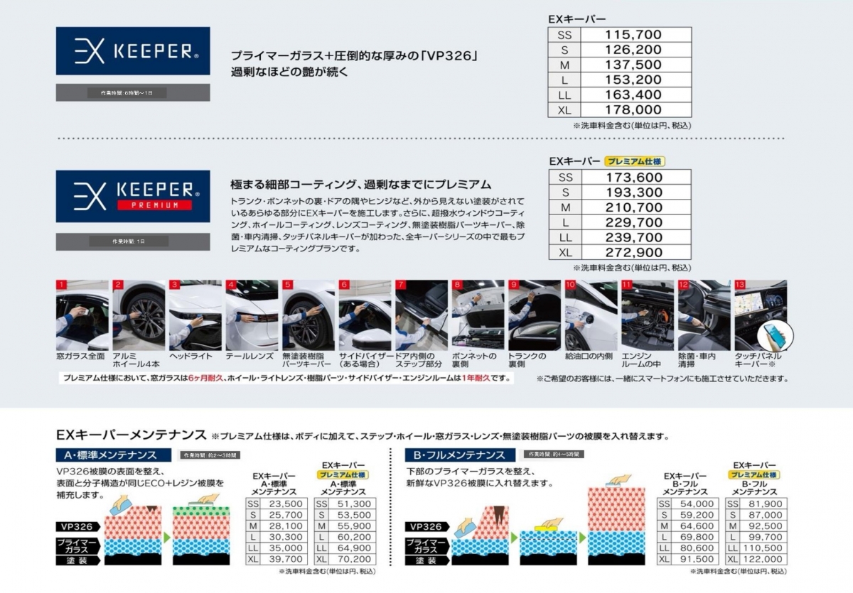 コーティング以外にも軽板金(リペア)や室内徹底清掃(グルーミング)など