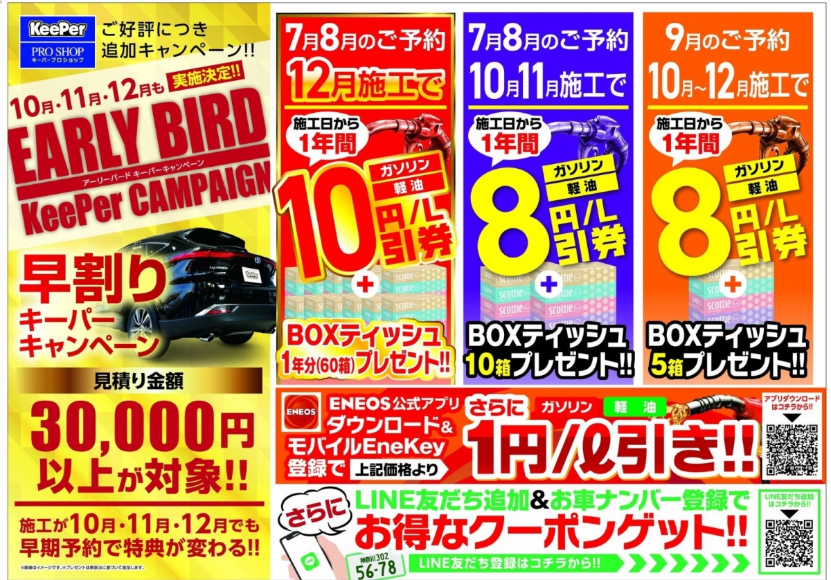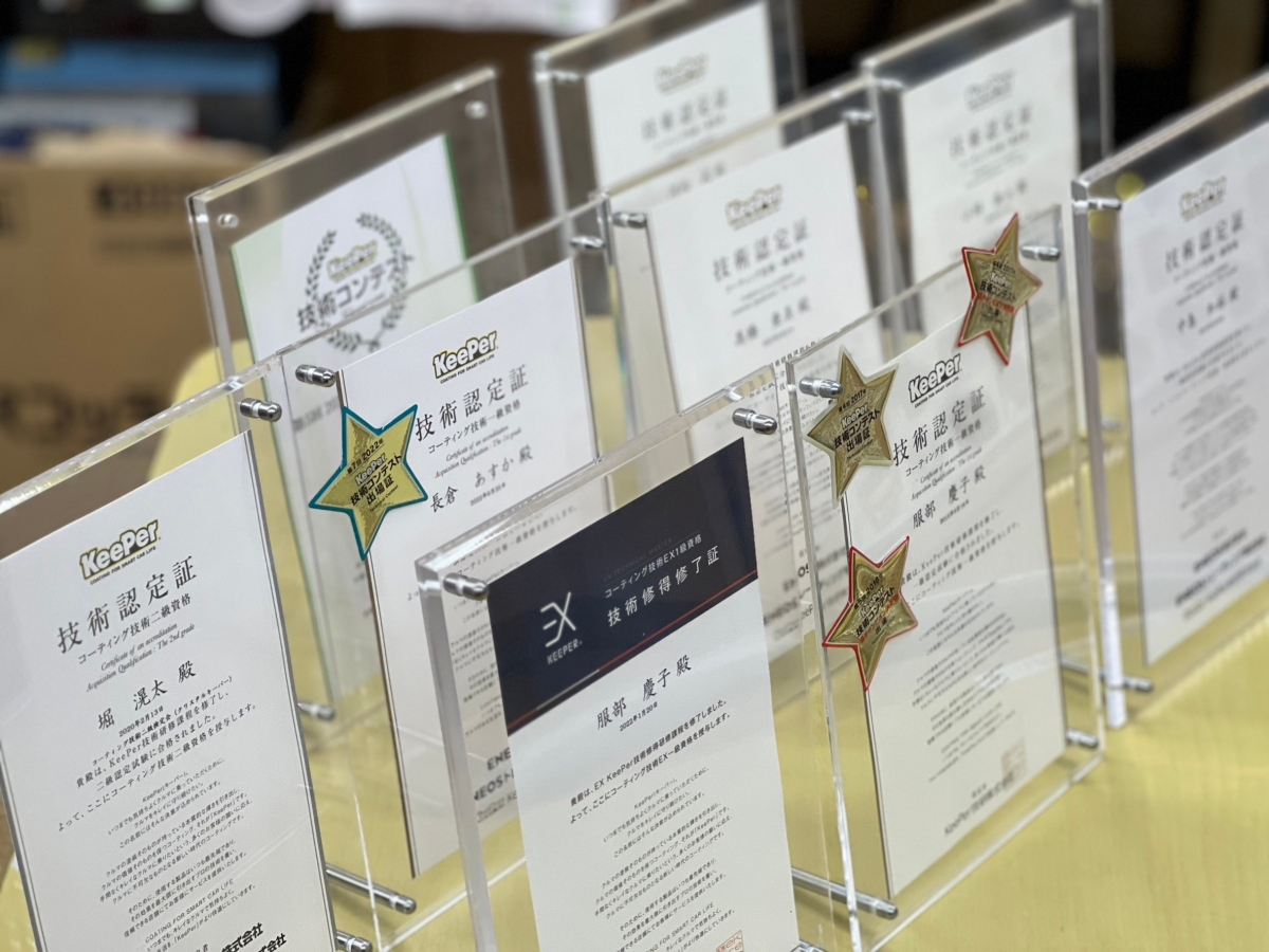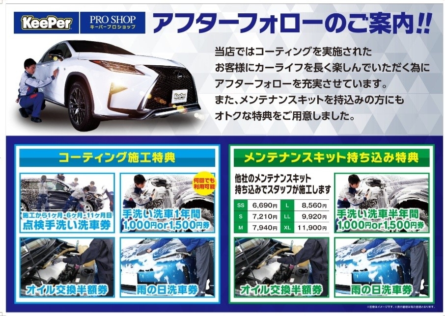当店では取扱いしてる全ての キーパーコーティングに 施工証明書を発行しています。 コーティングを施工している証明になることはもちろん 万一お車の板金・塗装する際に修理工場へ施工証明書をご提示されると 部分施工等、賠償保険の対象となる場合があります。 また当店では、1年耐久以上のコーティングには ☆年間5回の 手洗い洗車無料券も発行しております!! 当店のコーティングを施工していただくと 1年間手洗い洗車が特別価格で何回でもご利用できます