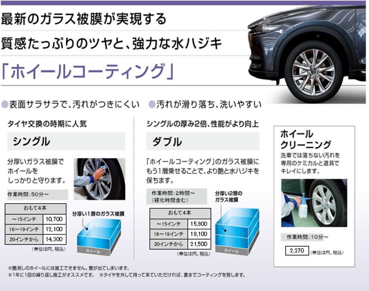 当店では手洗い洗車をはじめ、車内清掃、窓ガラスコーティング、ホイールコーティング、