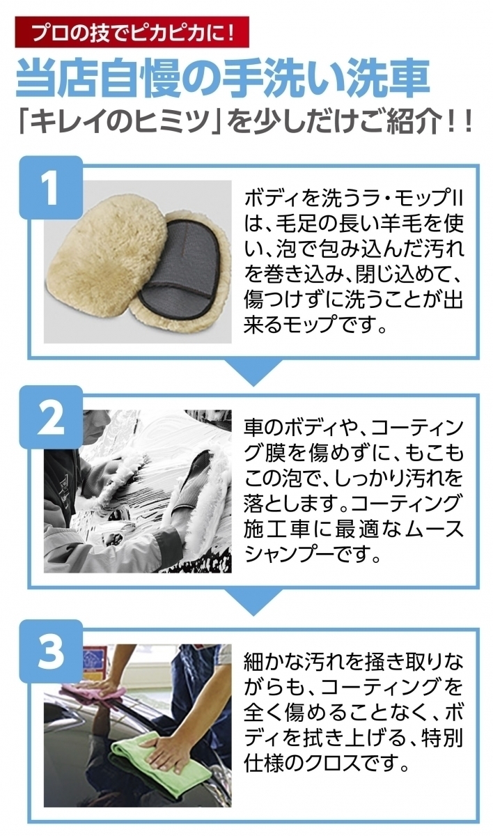 「ムース手洗い洗車」なら、安心してお任せいただけます。