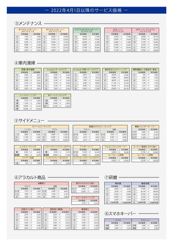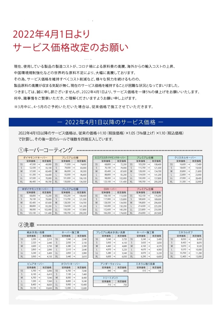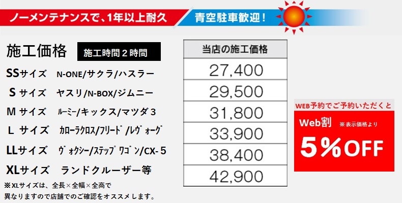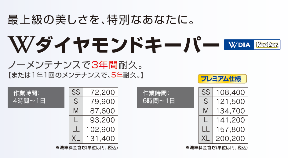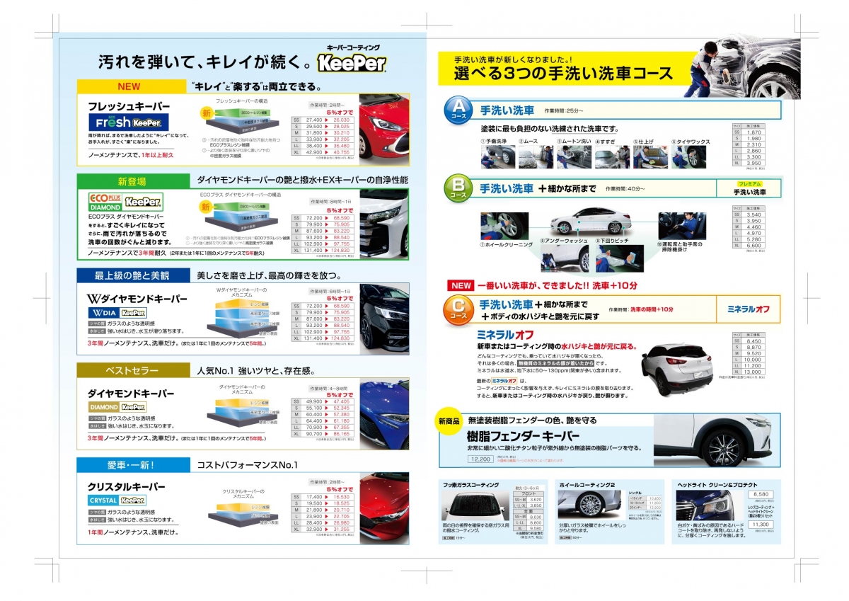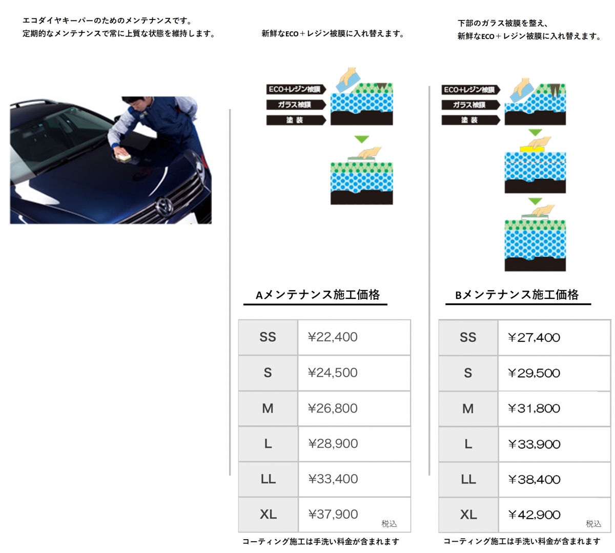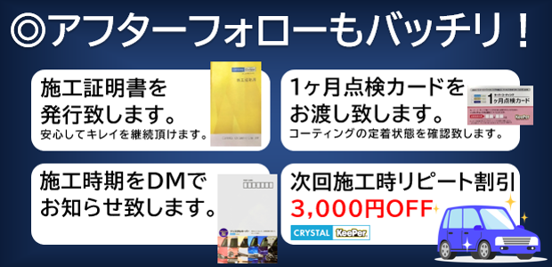 その他、コーティング被膜の定着状態の確認時の洗車サービス、次回施工時の割引なども行っております。