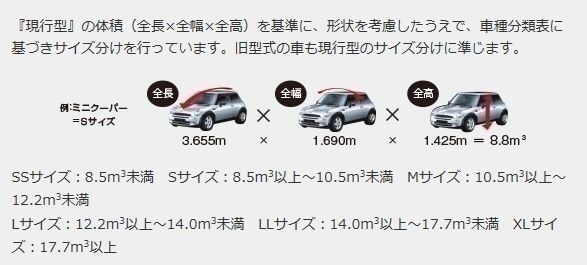 当店では公平に保つため、現行型の体積(全長×全幅×前高)を基準に形状を考慮したうえでサイズ分け(SSサイズ~XLサイズ)を行っています。 ※検索がわからないときは、お気軽に店舗までお問合せくださいね! 下の画像をクリックしていただければ、サイズ検索ができます。