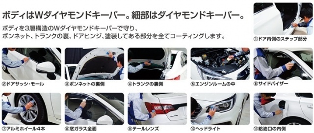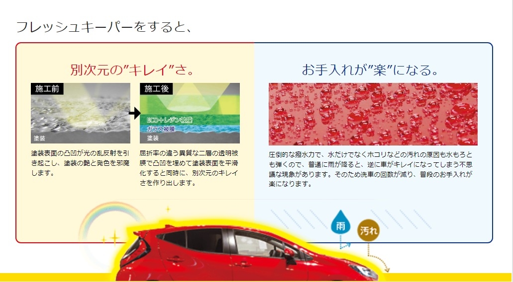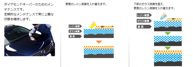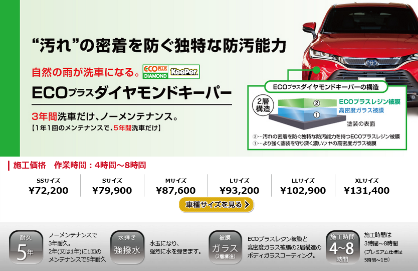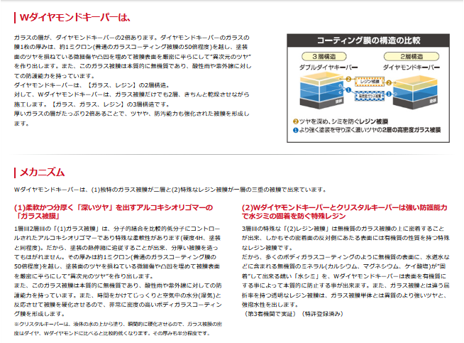 ダイヤⅡキーパーは、高密度ガラス被膜をベースに、新開発の有機レジン被膜「新ダイヤIIレジン」を重ねた2層構造。 従来のエコダイヤキーパーの防汚性能はそのままに、美しく、劇的に性能がアップした新しいボディガラスコーティングです。
