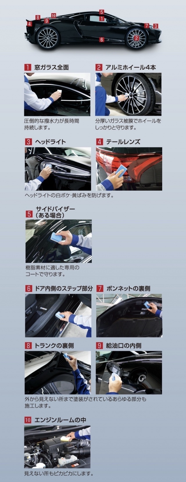 ガラス被膜とレジン被膜の2層構造でお車を守り、ガラス特有の艶が1年間持続し、キレイが続きます。