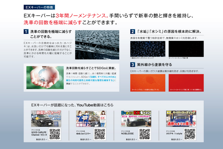 プライマーガラス + 圧倒的な厚みの「VP326」で過剰なほどの艶が続きます。 EXキーパーは艶だけではなく、圧倒的なはっ水力も持っている為洗車も楽になります!!
