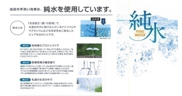当店では水シミ問題を軽減すべく、コーティング・手洗い洗車作業はもちろん、ドライブスルー洗車にまで純水を使用しております。