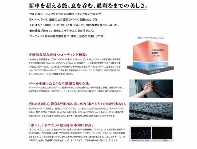 しかし、キーパーコーティングは2層構造、もしくは3層構造のコーティングとなっており、表面を覆うレジン被膜という特殊膜が水シミを固着させません。万がいち水シミが付いてもレジン被膜を入れ替えるだけでキレイな状態に戻すことができます。