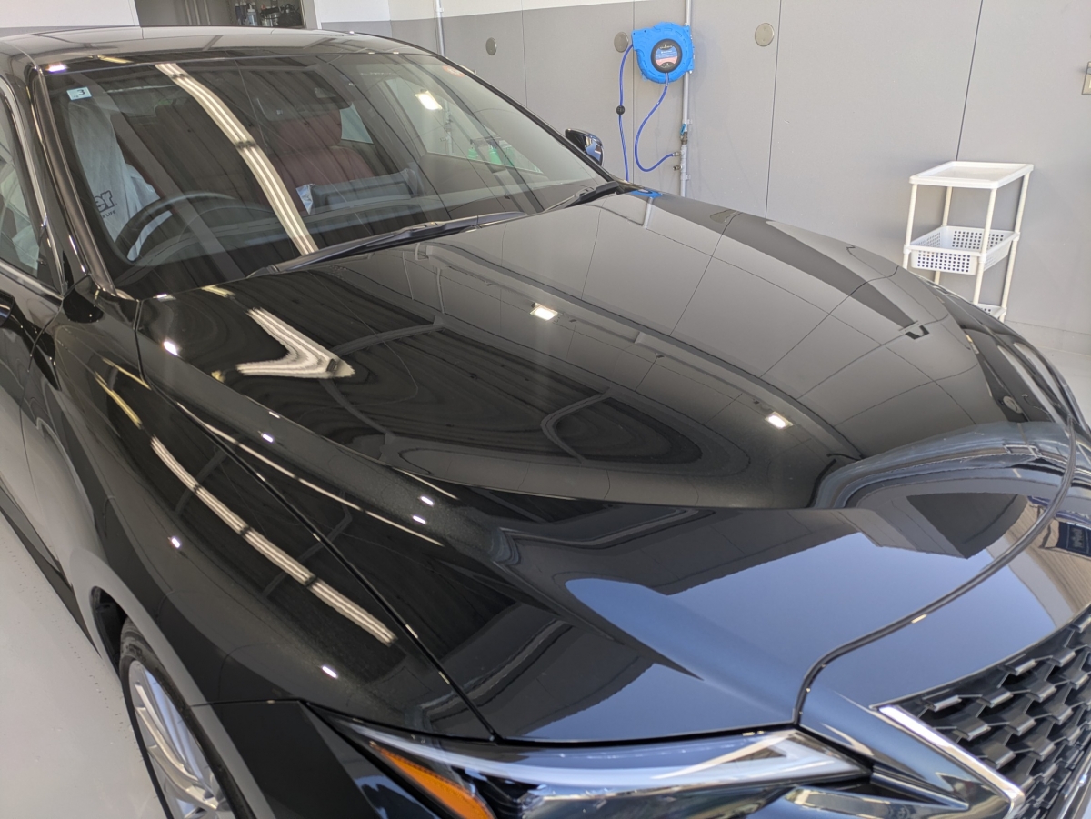 当店は『密閉型コーティング専用ブース』を完備しており、ブース内ではエアコン完備で施工中の水滴や溶剤などの乾燥焼き付きを防ぐため温度調整をおこなっております。洗車・コーティング作業時は水道水ではなくミネラル分を含まない『純水』を使用しており、お車の『キレイ』を一段引き上げる作業を標準化しています。