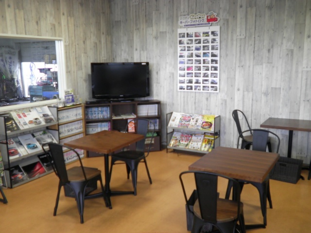広いサービスルームには中古車、リース、タイヤ、オイルなど車に関する情報がたくさんありますのでご覧いただけます。
