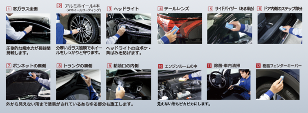 ボディ以外の細部まで(窓ガラス、ホイール、レンズ類、バイザー、ステップ部分、ボンネット・トランク裏側、給油口内側、エンジンルームの中)あらゆる部分まで施工する、プレミアム施工はEXキーパープレミアムになります。