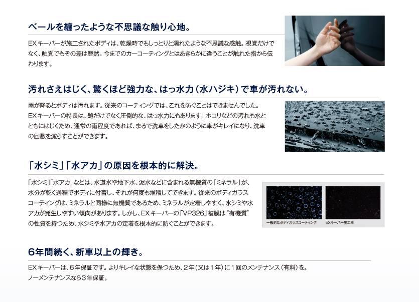 Wダイヤモンドキーパーは、ガラスの層が、ダイヤモンドキーパーの2倍あります。ダイヤモンドキーパーのガラスの膜1枚の厚みは、約1ミクロン(普通のガラスコーティング膜の50倍程度)を越し、塗装面のツヤを損ねている微細傷や凸凹を埋めて被膜表面を厳密に平らにして”異次元のツヤ”を作り出します。また、このガラス被膜は本質的に無機質であり、酸性雨や紫外線に対しての防護能力を持っています。