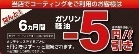 6ヶ月ガソリン・軽油-5円/ℓ引き!(店頭表示価格より)