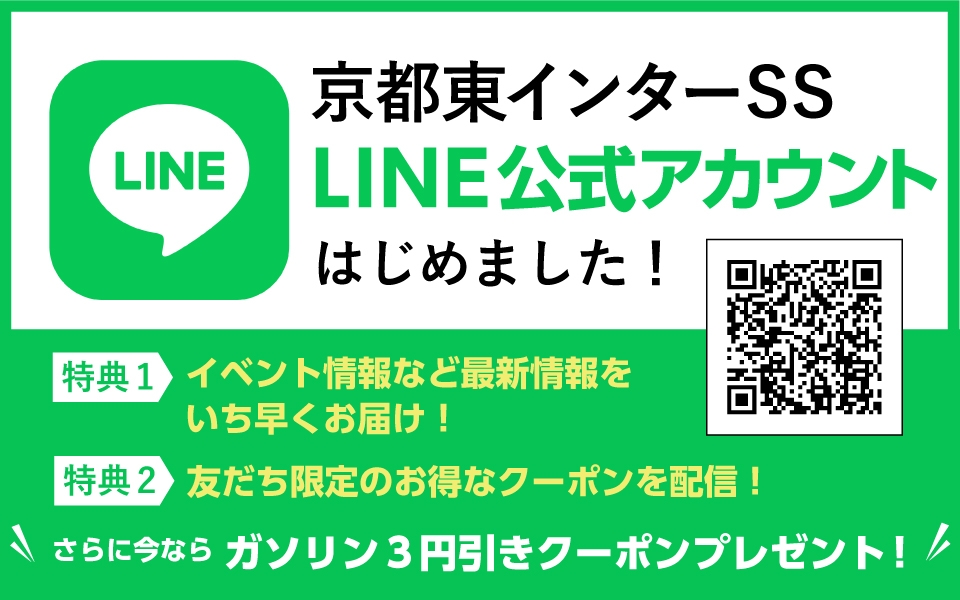 QRコードもしくは下記の「友だち登録追加」より、LINE公式アカウント「Enejet京都東インターSS」を友だち追加してください。登録するとLINEでメッセージが届きます。