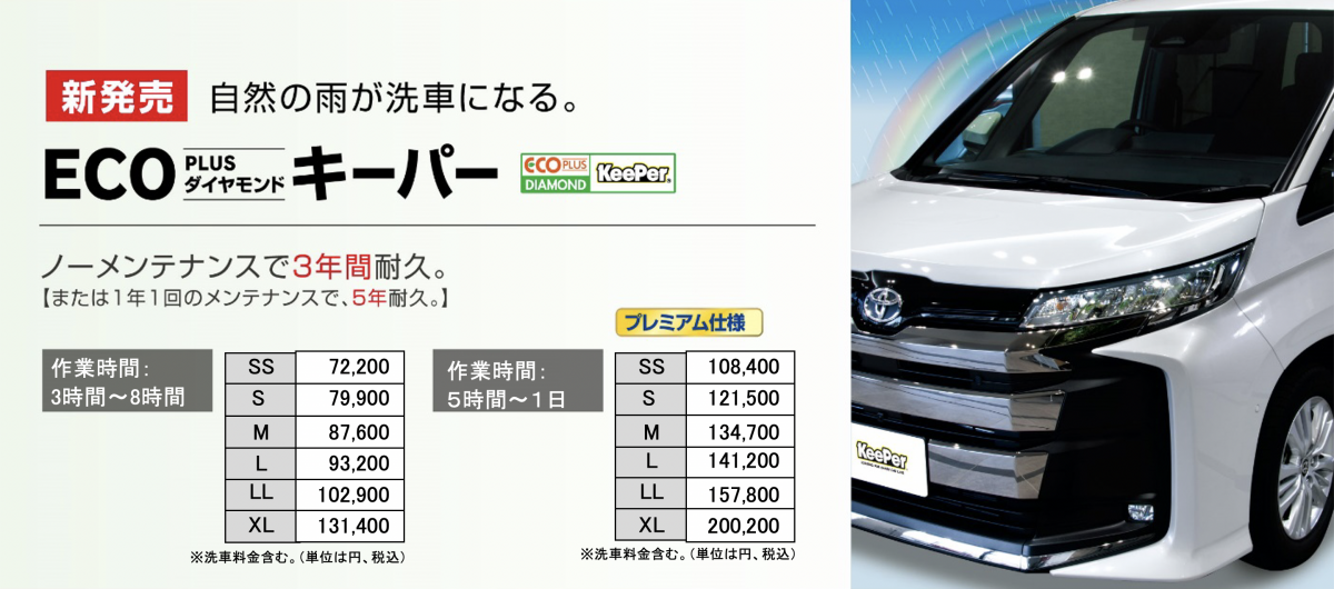 「ECOプラスダイヤモンドキーパー」はベストセラー商品のダイヤモン ドキーパー」の表面に、従来の『レジン2』の代わりに、新開発のケミカル『ECOプラスレジン』を施工した、雨が降れば洗車をしたようにキレイに なる効果を備えた新感覚の商品です。