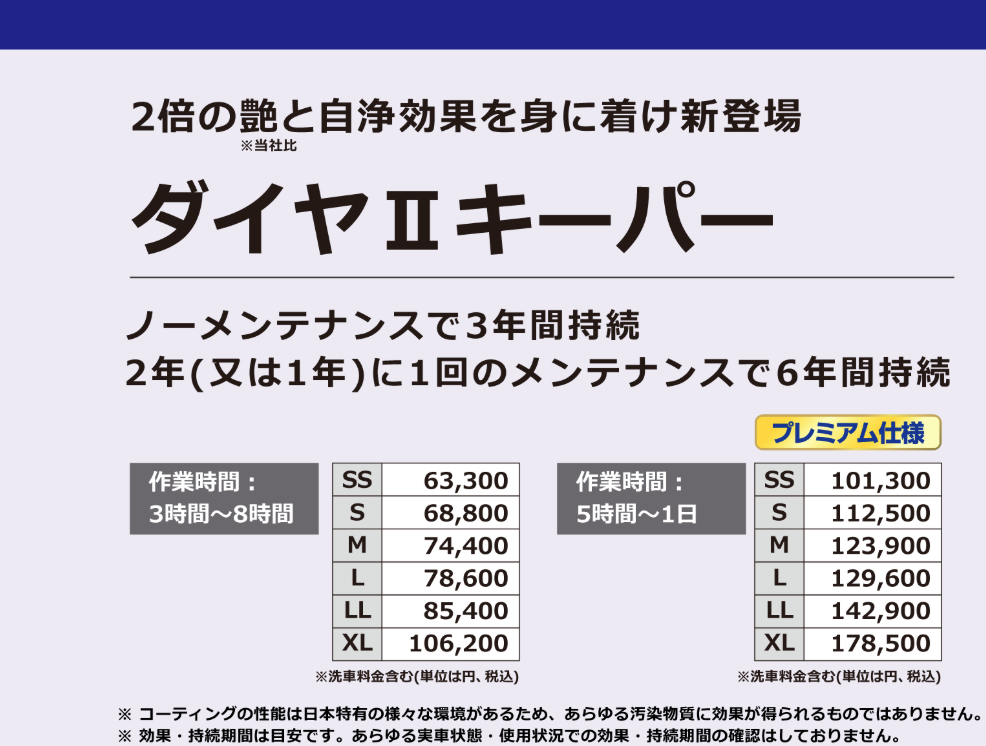 3年間洗車だけまたは5年間 (1年に1回のメンテナンス) 圧倒的な存在感、選べるプラン ダイヤモンドキーパー