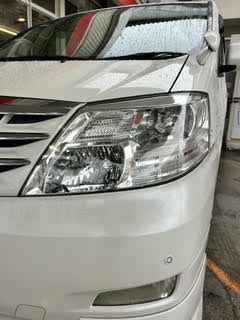 最近のお車のヘッドライトは、一番上のハードコートが、ポリカーボネート樹脂という素材のものが多く、紫外線などが原因で変色してしまいます(黄ばんでしまう)。当店では、耐水ペーパーで表面を磨き、コーティングを行うことにより新車のような透明感を維持することができます♪